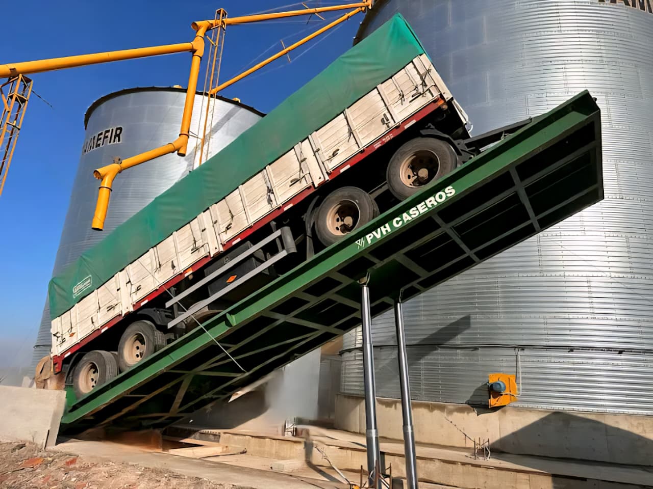 La volcadora hidráulica PVH Caseros representa la solución definitiva para la descarga eficiente de camiones en cerealeras, acopios y bodegas que buscan optimizar sus operaciones logísticas. Como fabricantes líderes de plataformas volcadoras en Argentina, hemos desarrollado un sistema que combina ingeniería de precisión con innovación tecnológica para satisfacer las necesidades más exigentes del sector agroindustrial.